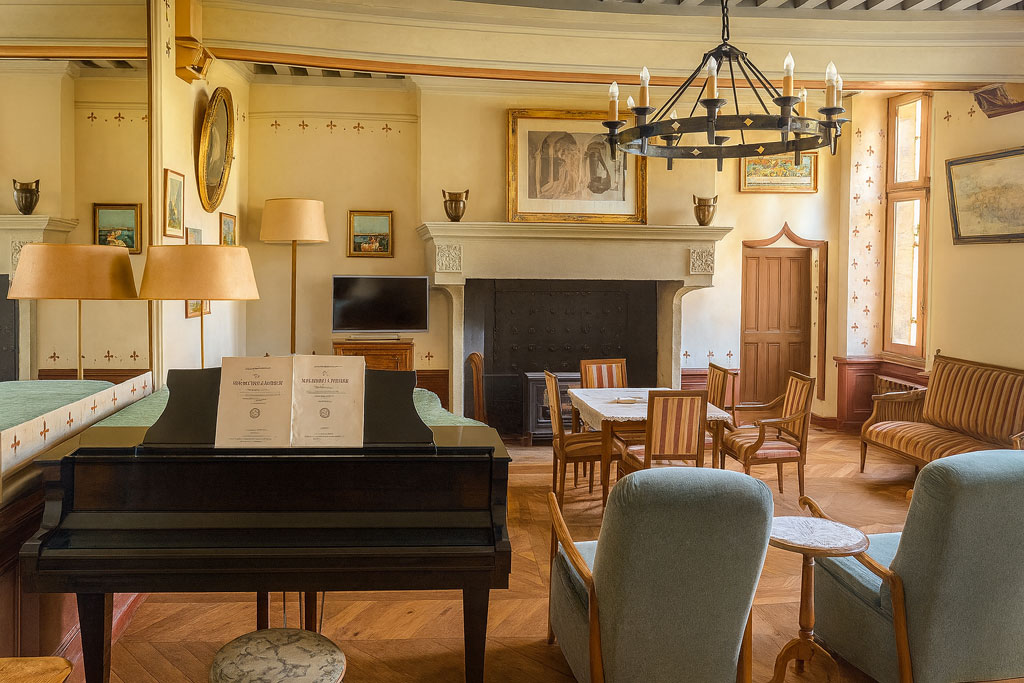 - Un salon de 44 m² doté d’un piano quart de queue (utilisation sur demande), d’un second poêle à bois, ... (voir équipements)