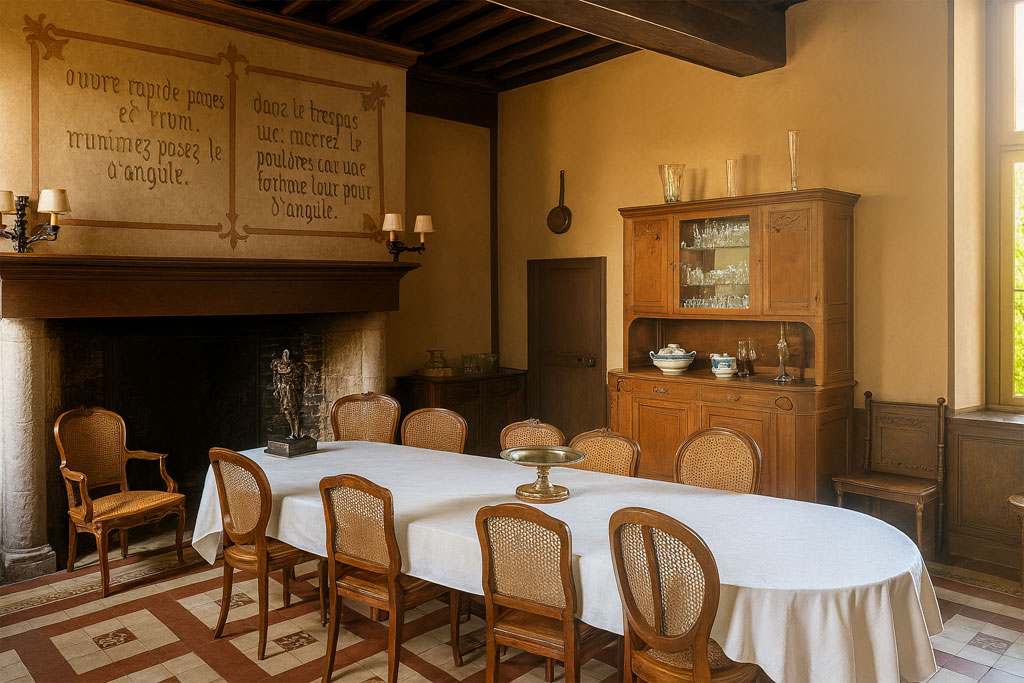 - Une salle à manger de 30 m² pouvant accueillir environ 20 personnes, équipée d’un poêle à bois