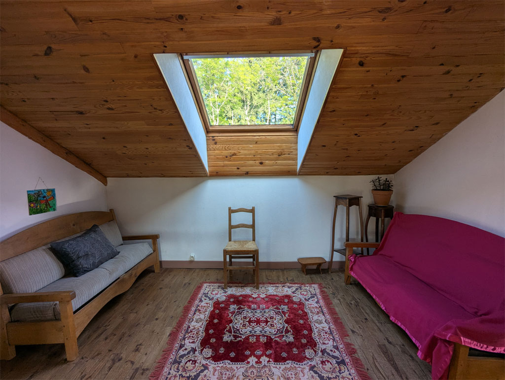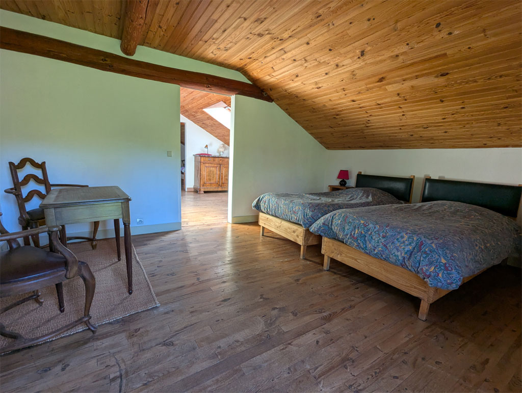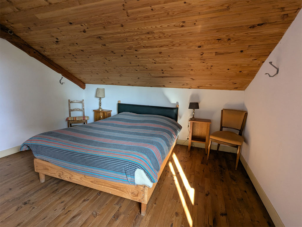 - 3 chambres : 1 au rez-de-chaussée (1 lit double) et 2 à l’étage (1 lit double et 3 lits simples)