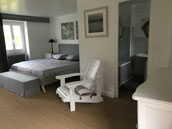 Une grande pièce avec lit en 180 et coin salon/TV, séparée d'un espace couchage 2 lits simples, salle de bain avec WC.