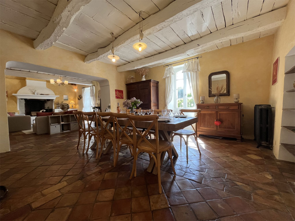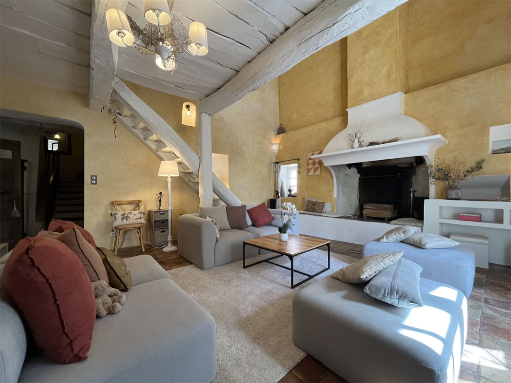 - un grand salon salle à manger de 65 m² avec cheminée et poêle Godin et une terrasse aménagée