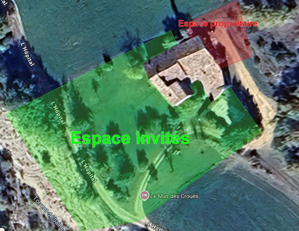 Le propriétaire habite sur place, il a sa propre entrée, son propre parking et donne sur l'arrière de la maison; il n'y a pas d'interaction. Voir le découpage expliqué sur le plan.