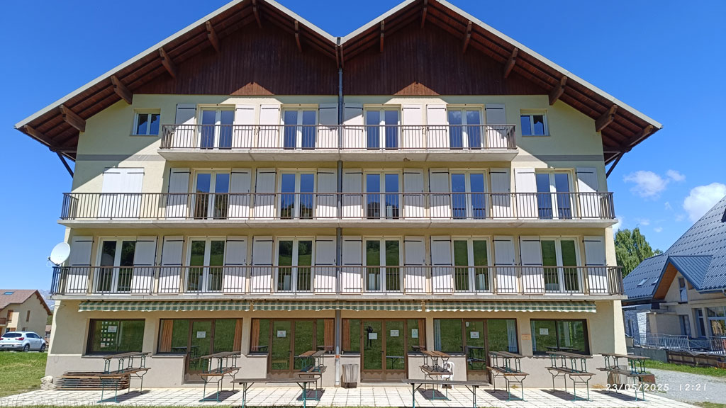 Structure de 45 chambres de 4 à 5 lits sur 3 niveaux avec sanitaires complets, 5 salles de réunion. Activités avec matériel audiovisuel. Grande salle de restaurant, terrasse spacieuse ombragée, terrain de 5000 m² exposé plein sud, face aux pistes.