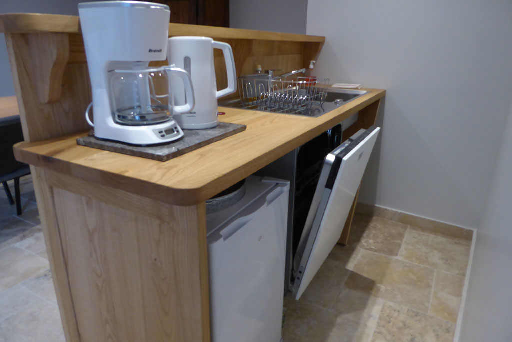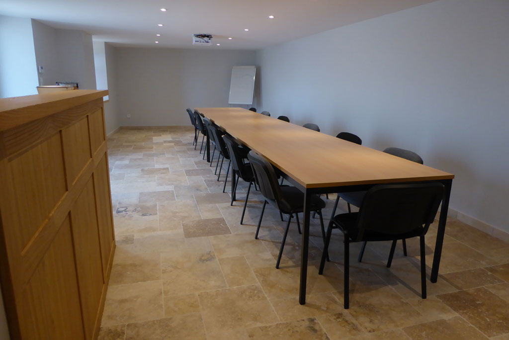 une salle entièrement équipée pour les séminaires, de 45 m² avec toilette, grandes tables et chaises, bar, évier, lave-vaisselle, réfrigérateur, vaisselle,