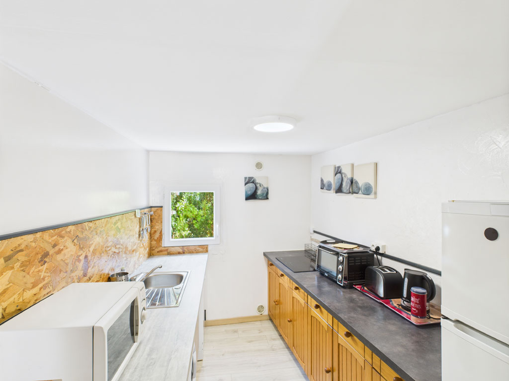 1 espace de vie avec TV et banquette donnant sur une terrasse privative - 1 cuisine aménagée et équipée + lave-linge - 1 sanitaire avec meuble vasque, douche