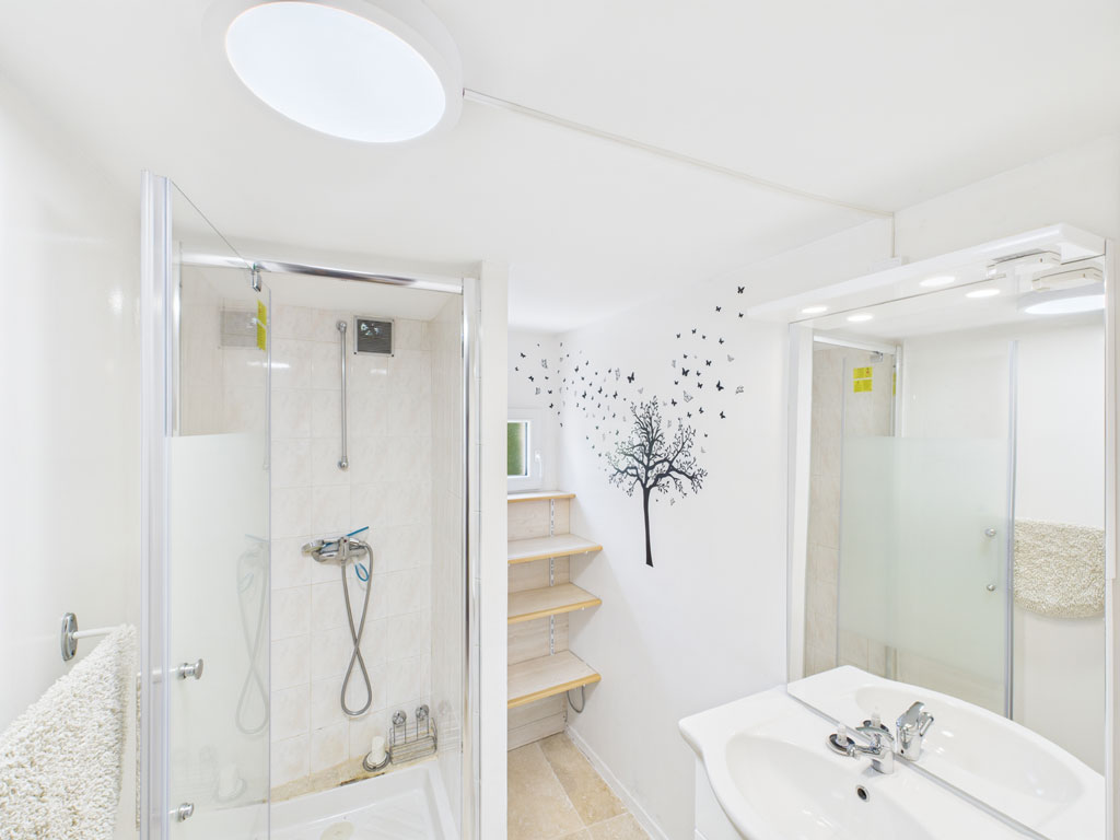 Chambre 5 (sous rampant) : type dortoir avec 2 lits 160 + 1 lit de 90 ainsi qu'une salle d'eau douche meuble vasque et WC