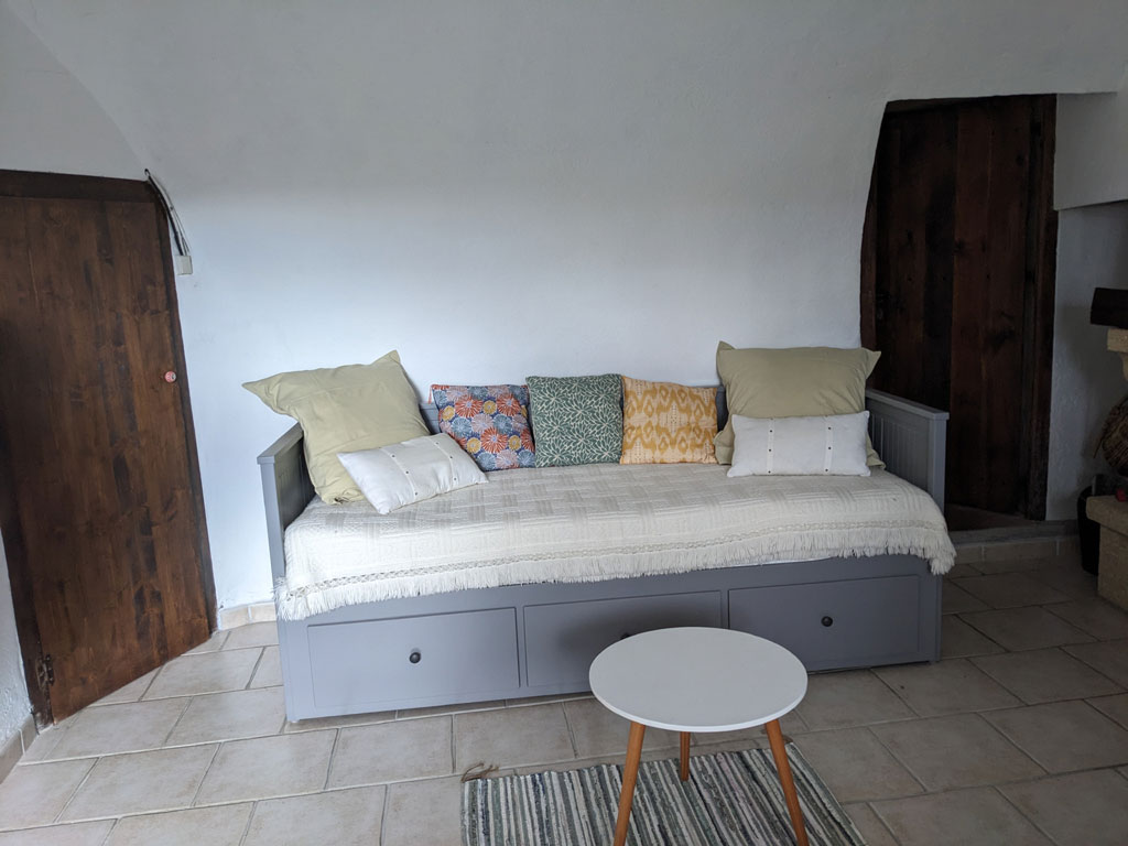 Un salon équipé d'une cheminée, d'un canapé lit.