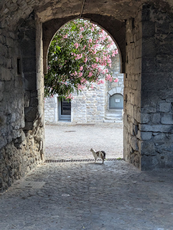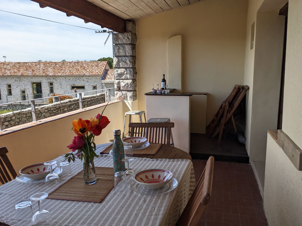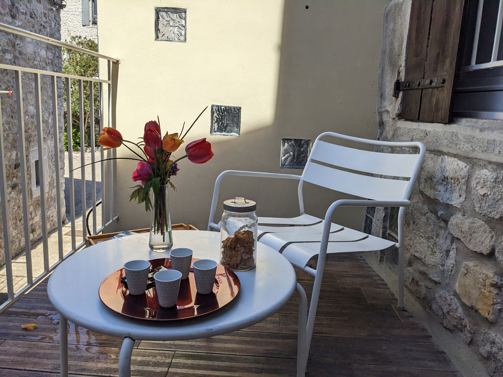 Maison de village de 1800, atypique, avec une terrasse couverte au sud et une petite terrasse au nord sur la rue piétonne. Sylvie Rohms