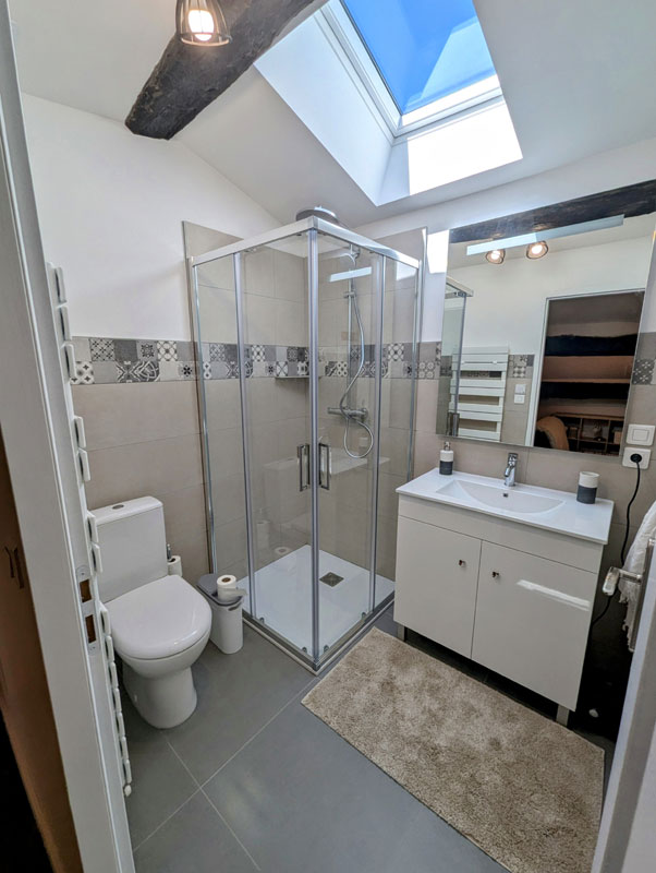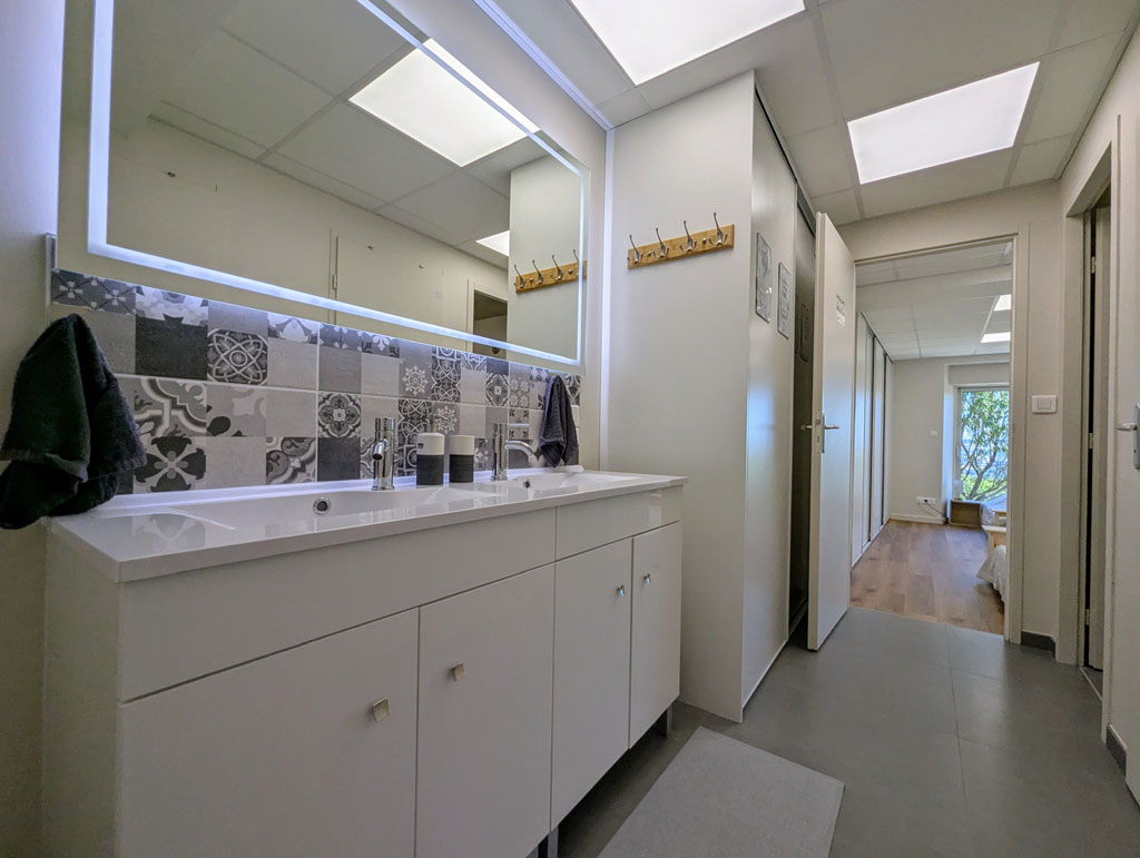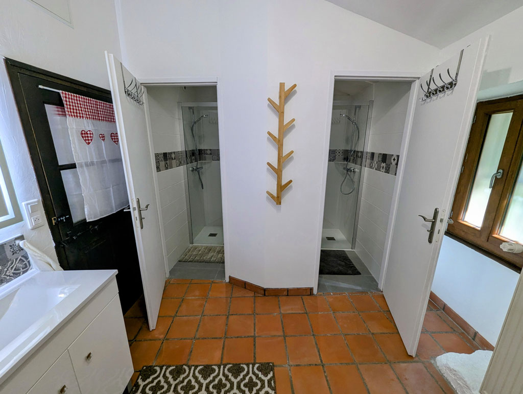 Une salle de bain au rdc contenant deux douches privatives, deux WC avec lavabo au rdc, une salle de bain avec douche et WC à l'étage.