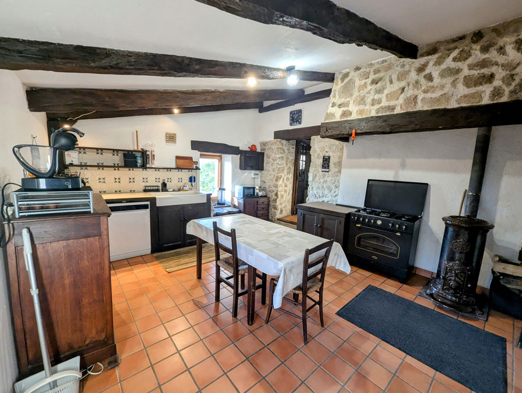 Une cuisine (environ 20m²) toute équipée avec gazière 5 feux et poêle à bois.