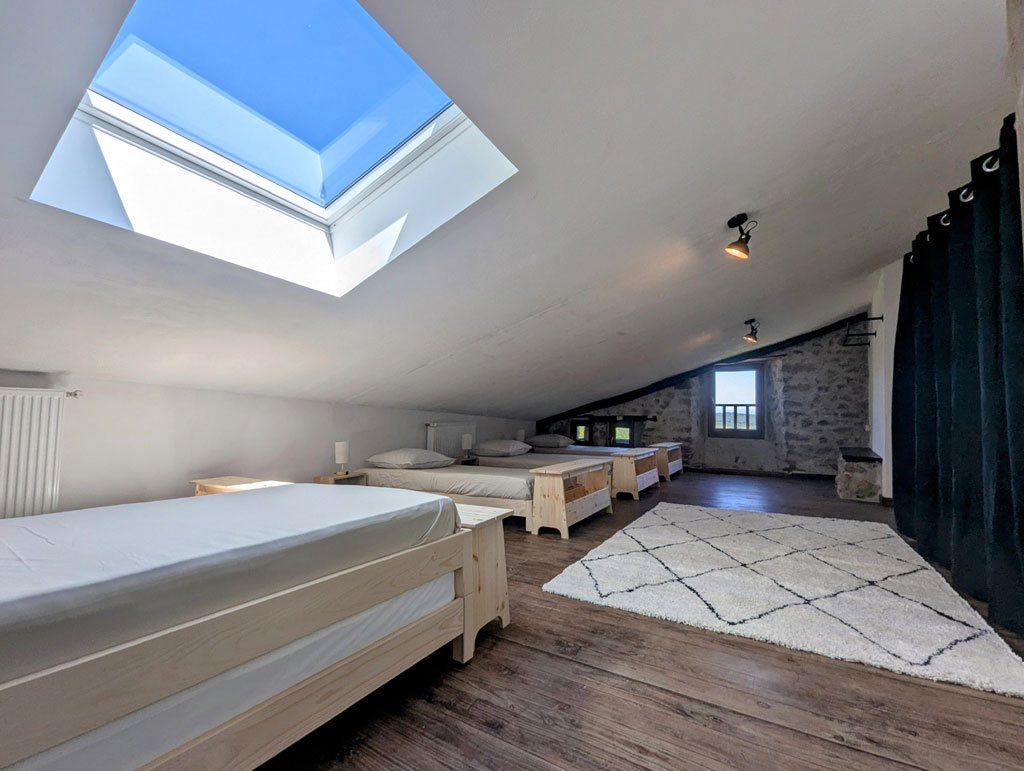 Un dortoir de 6 couchages (lits simples), 4 chambres avec un lit double chacune (un en 180, deux en 160, un en 140).