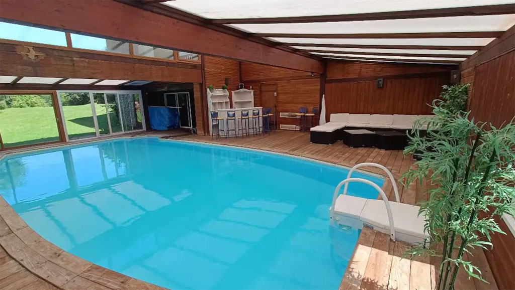 A quelques kilomètres de Saint-Girons, belle propriété de 450 m² avec vue sur la montagne, au milieu d'un hectare de forêt au cœur des Pyrénées Ariégeoises. Piscine couverte 10x5 m, chauffée du 1er mai au 30 octobre, sauna, 2 terrasses extérieures, jardin et stationnement pour nombreux véhicules. La Chamade, maison charmante et spacieuse, vous accueille jusqu à 13 personnes pour un séjour en famille ou entre amis. Le jardin verdoyant, le barbecue, la piscine et le sauna permettent de partager d'agréables moments conviviaux.