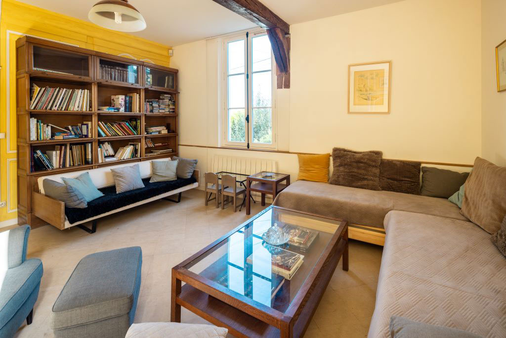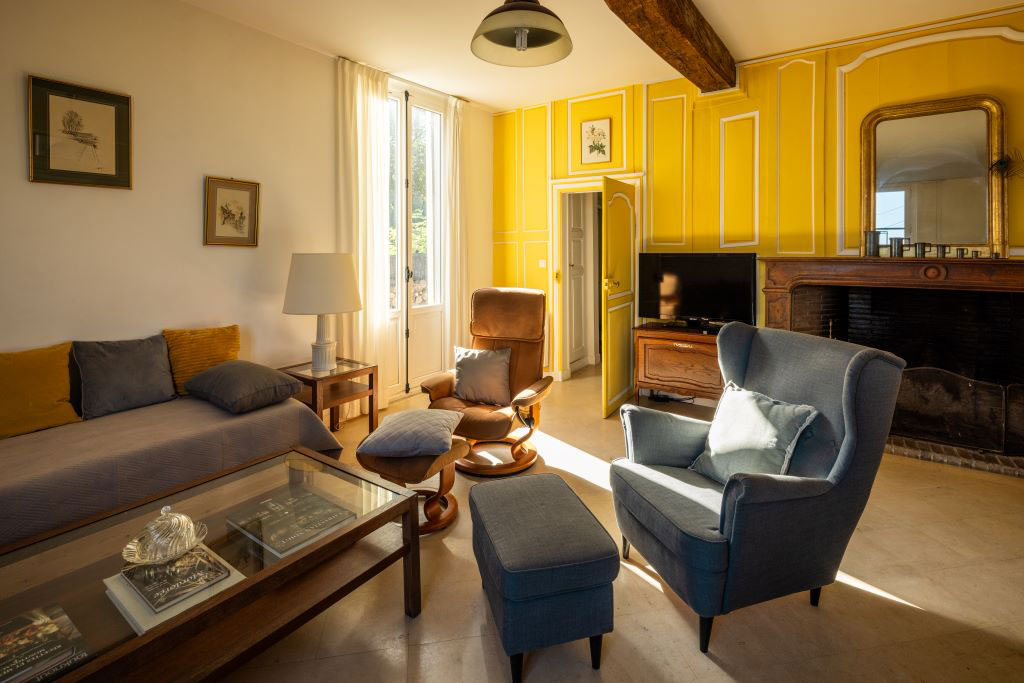 Grand Salon avec cheminée, canapés, banquette, fauteuils avec repose-pieds indépendants