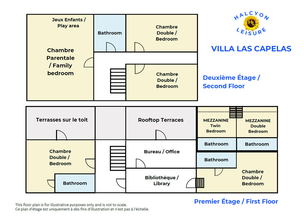 Il y a 4 chambres doubles et une chambre familiale avec quatre lits, reparties entre le premier et le deuxième étage. Puis, face au jardin, côté nord, au-dessus de la salle de sport, se trouve une chambre double sur une mezzanine, avec une salle de douche attenante. Au-dessus de la salle de jeux, une autre mezzanine accueille une chambre avec lits jumeaux, également dotée d'une salle de douche attenante..