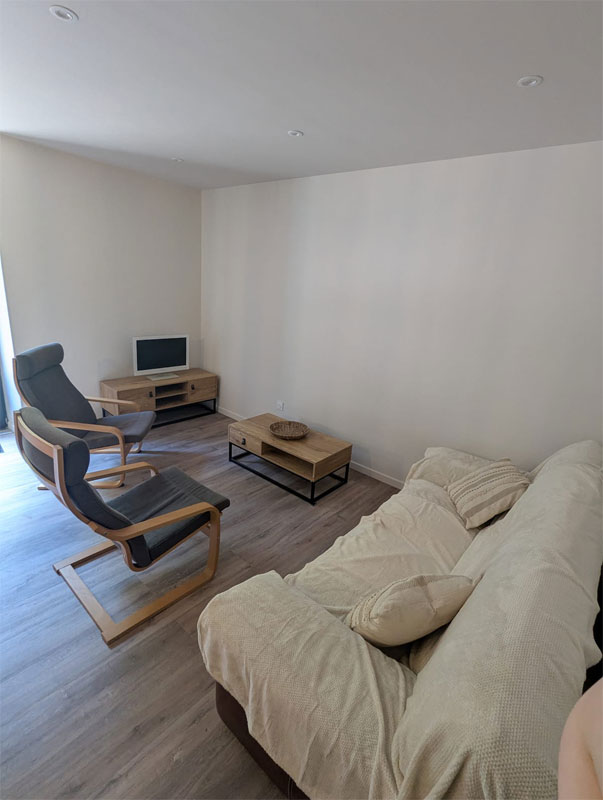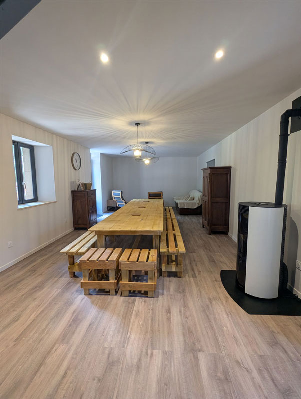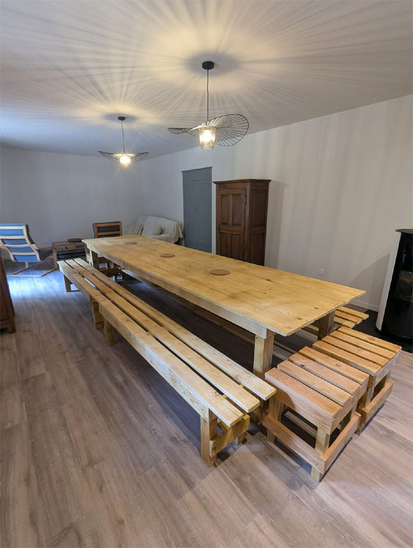 - 1 grande pièce à vivre comprenant un espace salle à manger avec une grande table en bois de 4m et un espace salon/TV avec un canapé et deux fauteuils