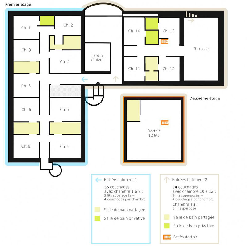Grand gîte d'une capacité de 67 couchages déclinés en 14 chambres et un dortoir, 10 salles d'eau, 4 blocs WC. Les hébergements situés au premier étage du gîte sont répartis en deux espaces distincts, côte à côte et une chambre au rez-de-chaussée.