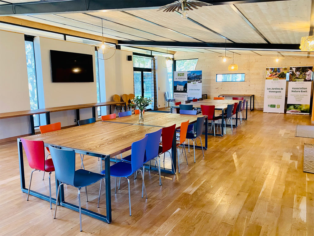 Notre salle de séminaire/réception l'Atelier de 140m², entièrement équipée, vous permet de vous réunir pour partager vos repas de groupe.