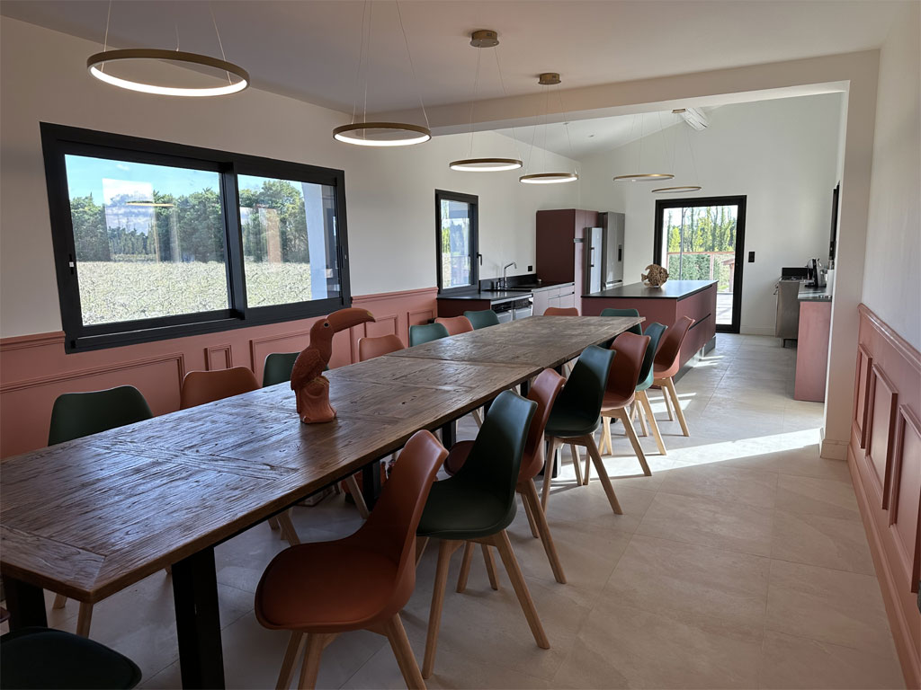 L'immense cuisine vous permettra de préparer à plusieurs de bons repas que vous prendrez à l'abri du soleil sur la grande terrasse où l'on domine tous les vergers. Vous pourrez prendre vos apéritifs/cafés et autres gouter dans le salon du pool house de 55 m² à l'abri du soleil avec frigo évier, machine a café le tout à proximité de la piscine sécurisée de 5x10m où vous pourrez vous détendre sur les nombreux bains de soleil...
