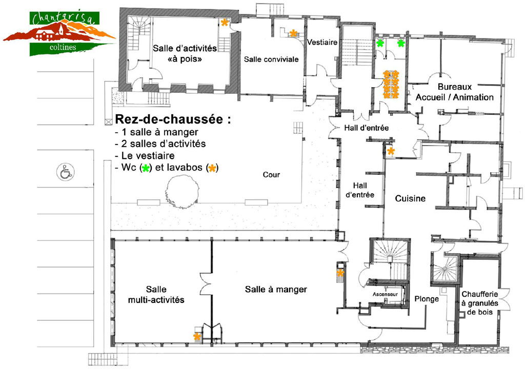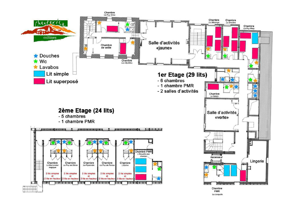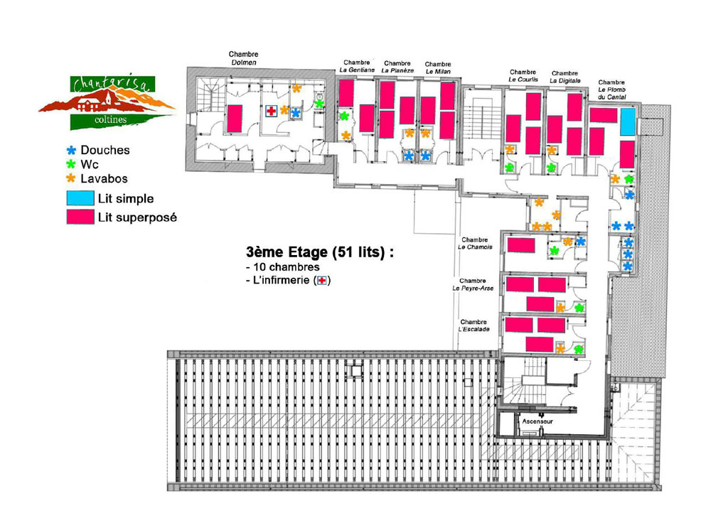 Chambres avec cabinet de toilettes complet. Chambres simples avec lits superposés et WC et lavabos. 2 Chambres PMR. Ascenseur tous niveaux.