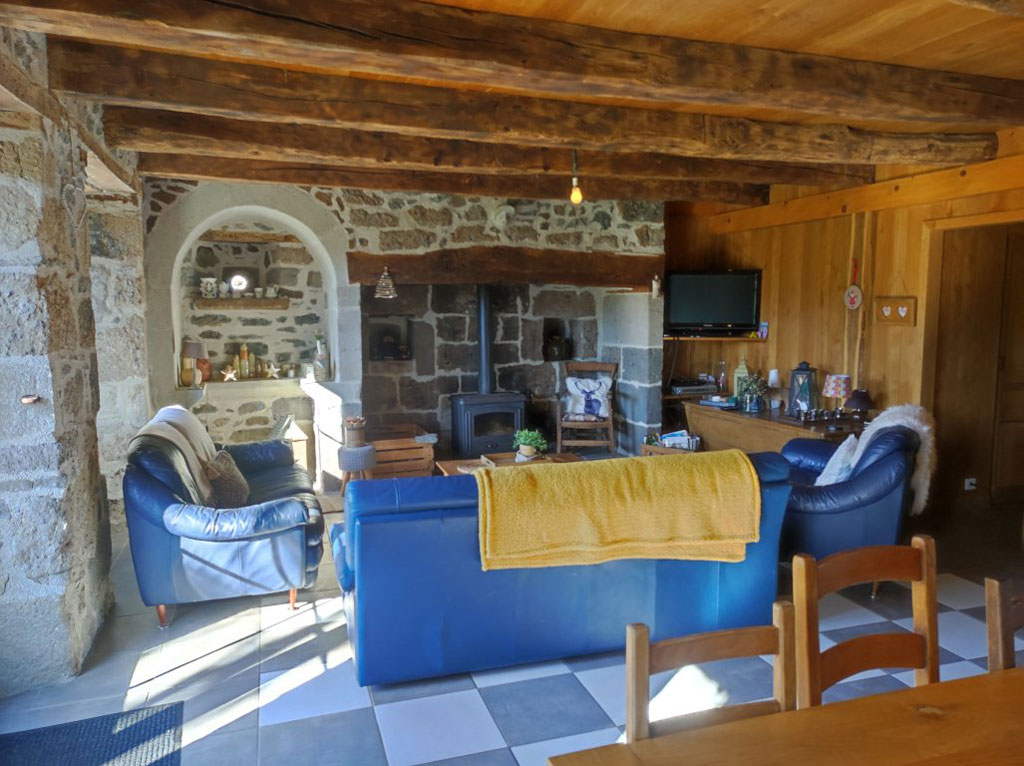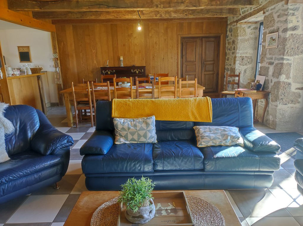 - 1 pièce de vie avec cuisine ouverte sur salle à manger + salon avec canapés et cheminée