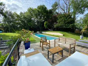 Autour de la piscine privative (12x3m) : Terrasse - Salon de jardin - Chaises longues)
