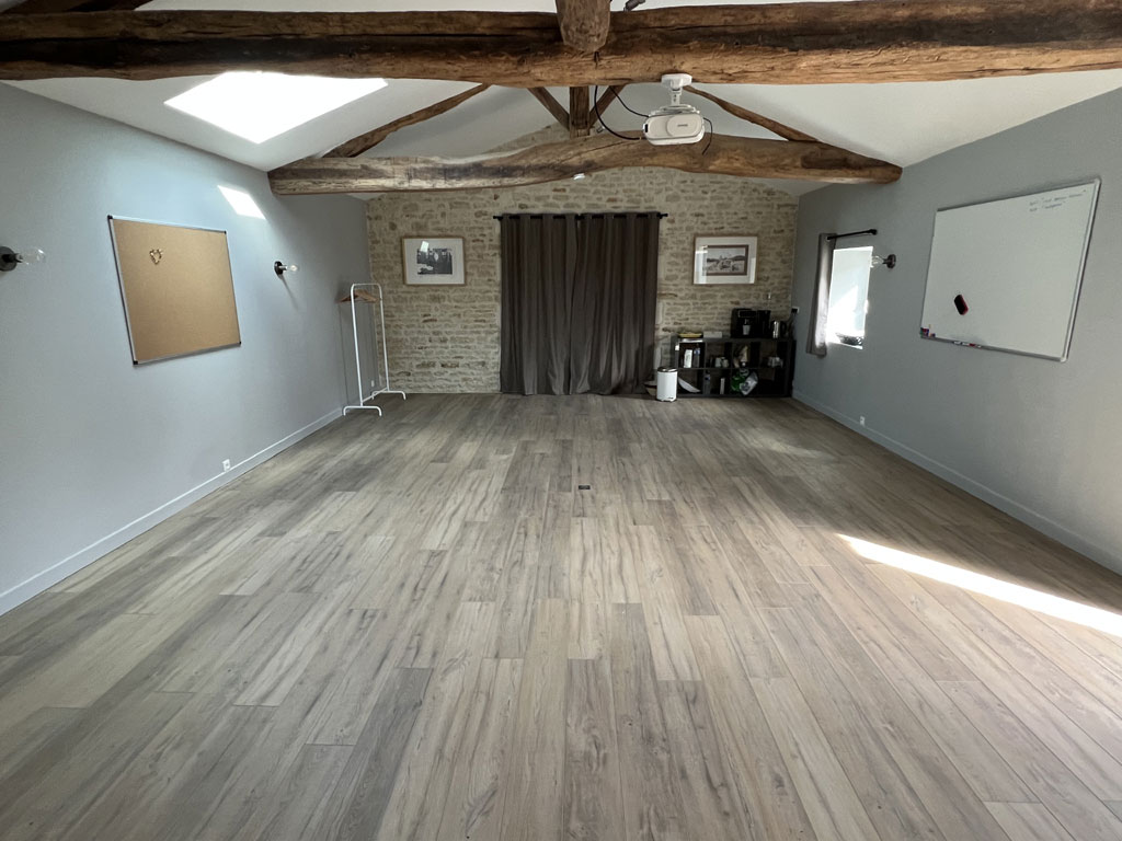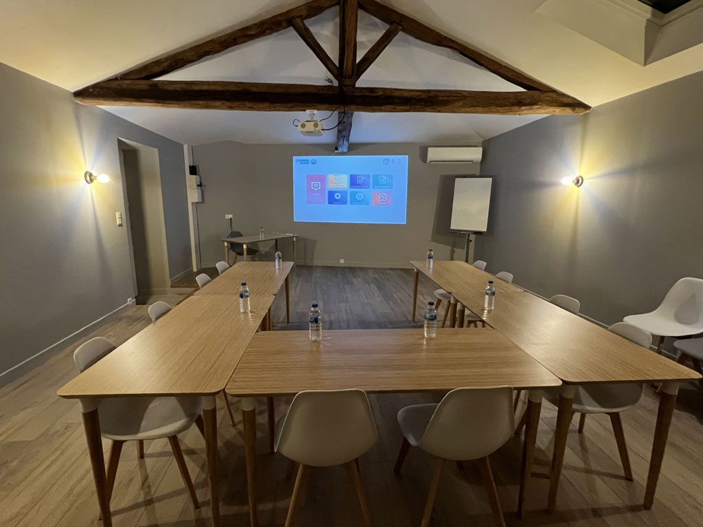 Une salle polyvalente (réunion, yoga, réception) de 60 m² peut accueillir 15-20 personnes (configuration séminaire) et 30 personnes (mode conférence).