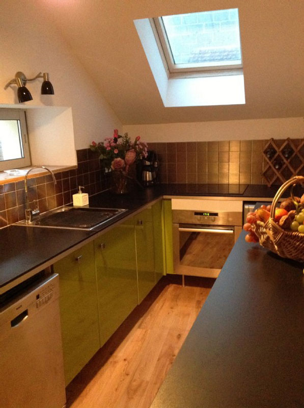 Réfrigérateur - Plaques à induction - Four - Micro-ondes - Cuisinière - Vaisselle pour 35 personnes - Lave-vaisselle - Lave-linge - Sèche-linge - Cafetière - Bouilloire