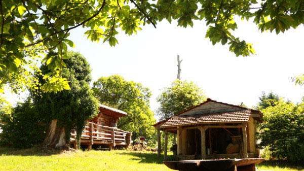 Sur l'aire naturelle de camping : 2 sanitaires communs en éco-construction, équipés d'un chauffe eau solaire et de toilette à litière biomaitrisée. Une cuisine d'extérieure permet l'autonomie.