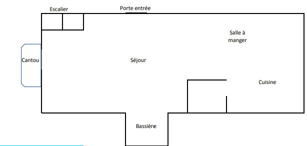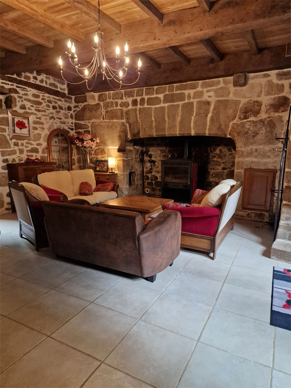 - 1 pièce à vivre de 75 m² comprenant un espace séjour, une cuisine équipée et un espace salon avec grand cantou aménagé d'un poêle à bois