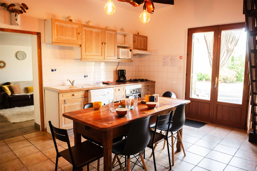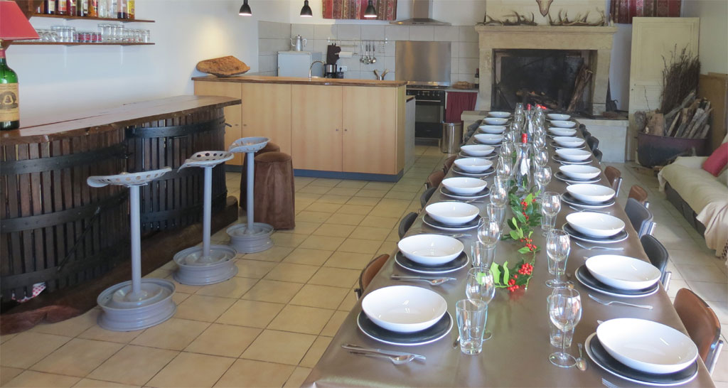 Une salle commune équipée (70 m²) autour d'une grande tablée festive, idéale pour partager vos petits-déjeuners et repas dans la bonne humeur. La cheminée majestueuse du 17ème siècle illuminera les soirées hivernales.