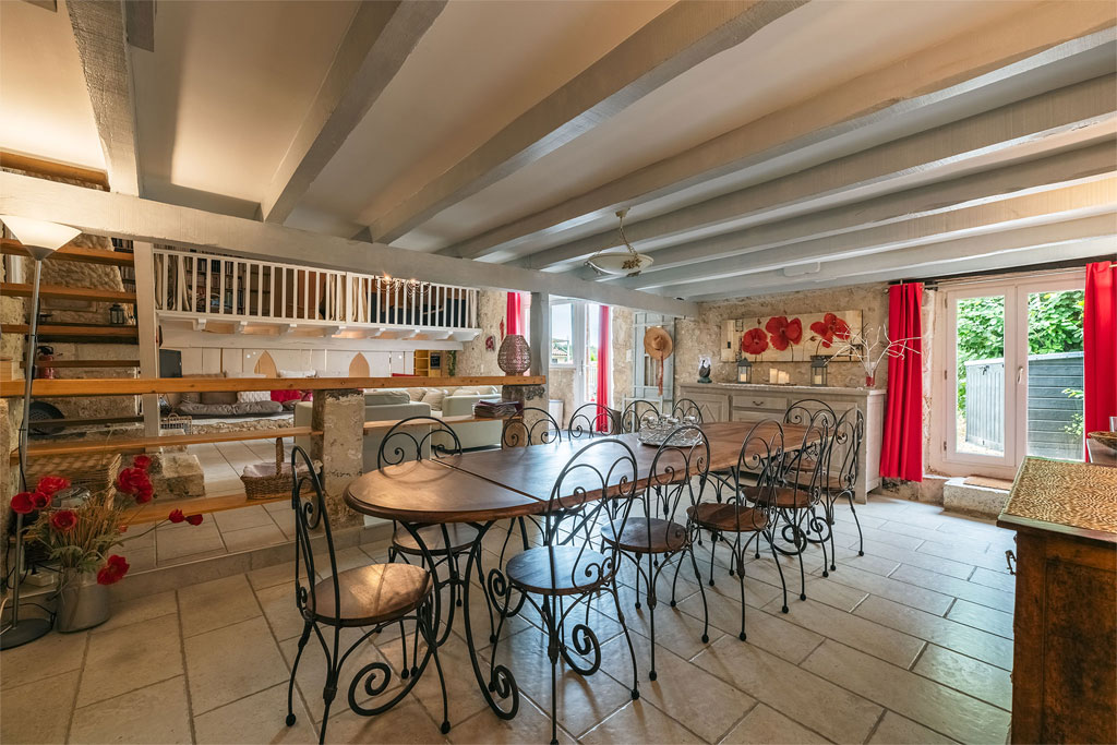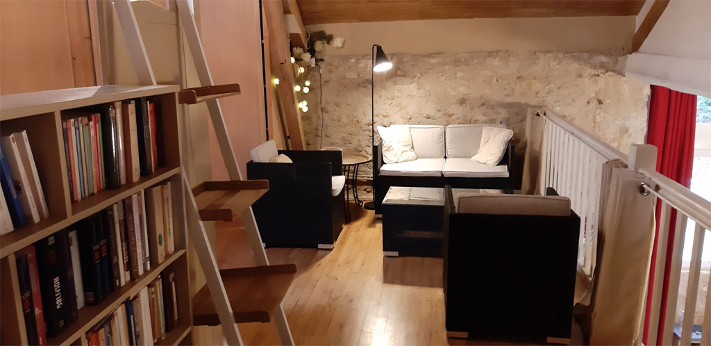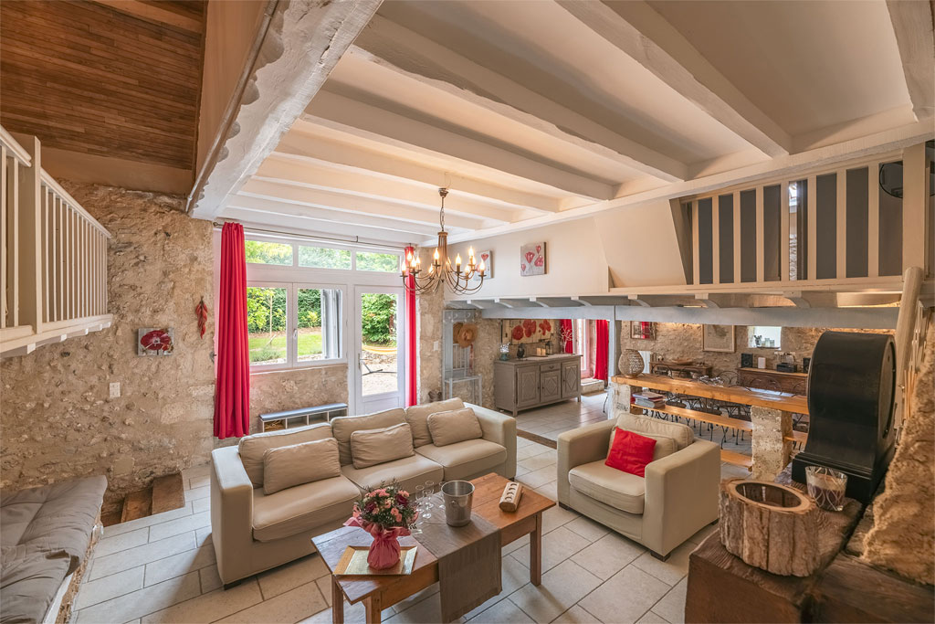 - Accès à l’étage et à la mezzanine par 1 escalier de chaque côté de la cheminée