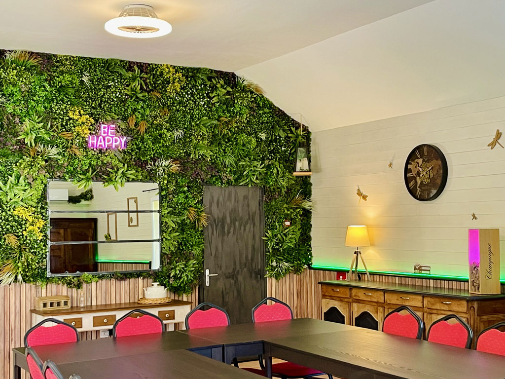 Salle de réception pouvant recevoir jusqu’à 44 personnes + cuisine équipée.