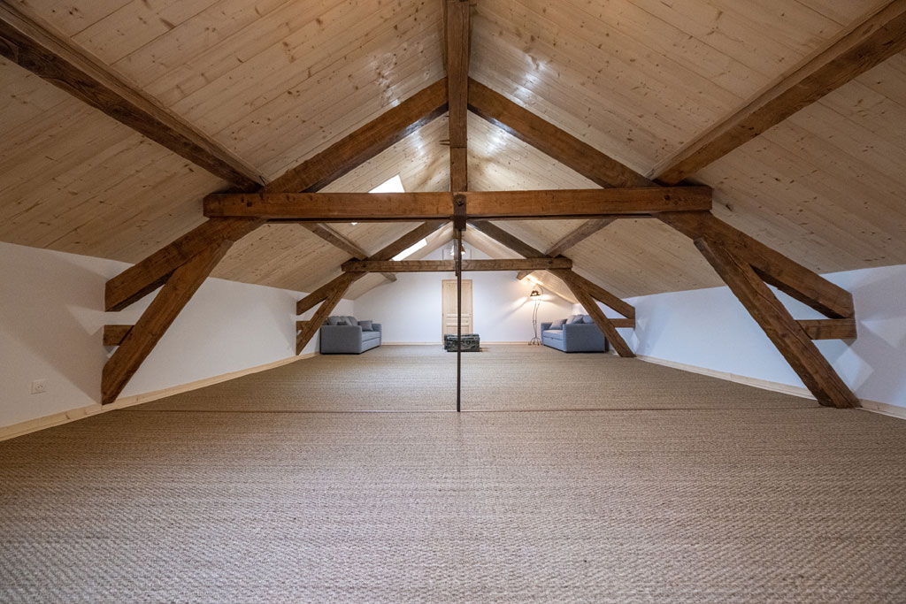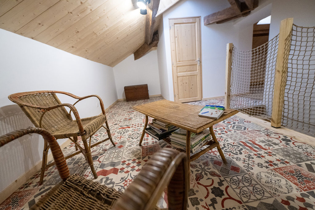 • 1 grenier entièrement réaménagé avec une bibliothèque, jeux de société, 2 canapés sur 90m², idéale pour séminaire de yoga ou bien être.