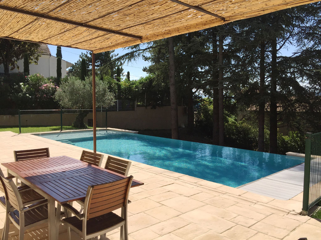 En Provence : située sur les hauteurs dans quartier résidentiel très au calme, dans une propriété de 4000m² avec une pinède d'arbres centenaires, maison contemporaine de 220m², avec piscine privée (sécurisée et chauffée).