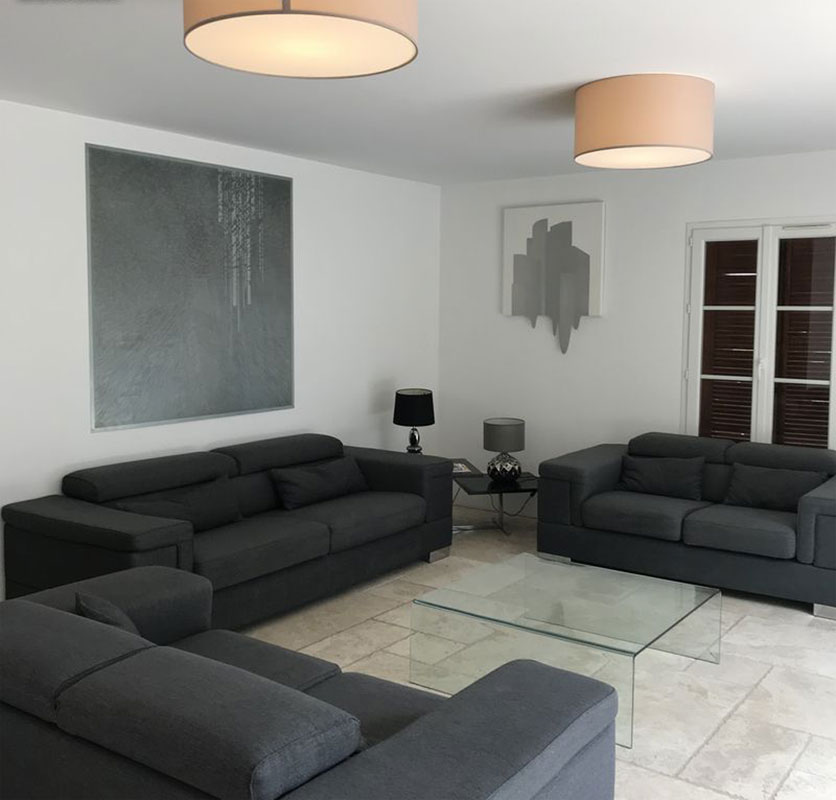 Salon de 45 m² avec 3 canapés et grand écran plasma 127cm, cuisine de 28m² avec réfrigérateur américain, lave-vaisselle, plaque à induction,...