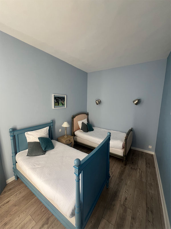 Chambre Jules est une suite familiale jusqu’à 5 personnes avec un lit double de 160 cm & 3 lits simples de 90 cm. Salle de bain privative avec baignoire et WC.