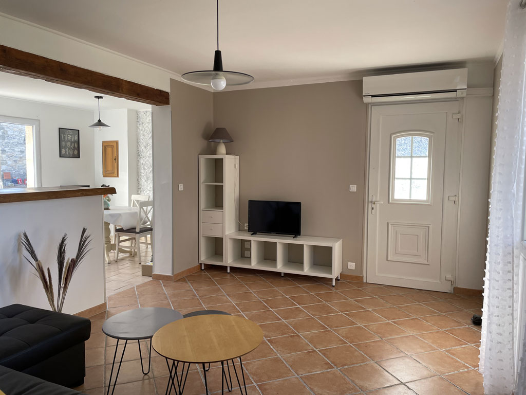 Un très grand séjour et son coin repas, son coin salon avec TV et vue sur les vignes (30 m²)