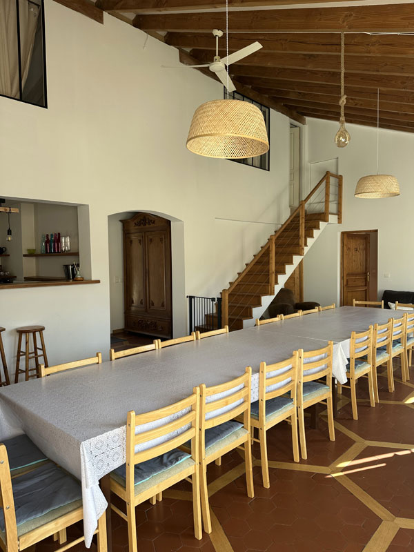 Ensemble de bâtiments autour d'un patio, en tout 9 chambres fermées et 2 ouvertes. 5 salles d'eau, 5 WC et 1 grande salle à manger.