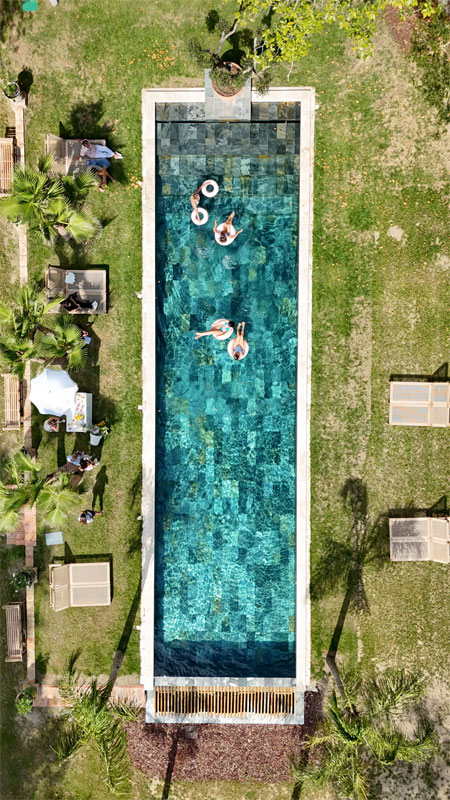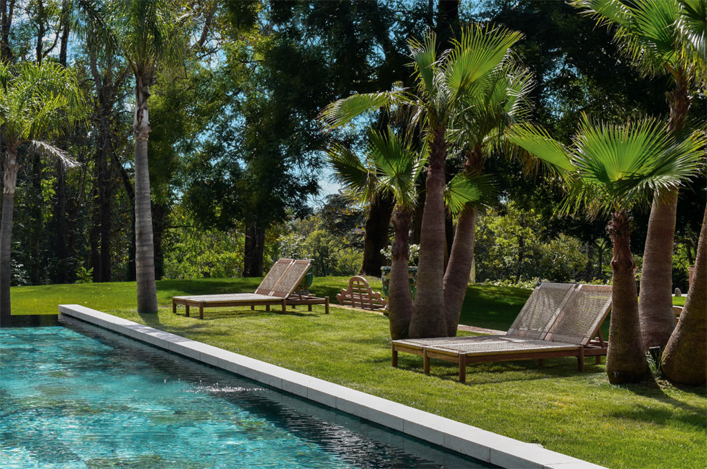 Piscine chauffée à débordement de 20 mètres de long (d'avril à octobre) - Terrasse - Salon de jardin - Chaises longues