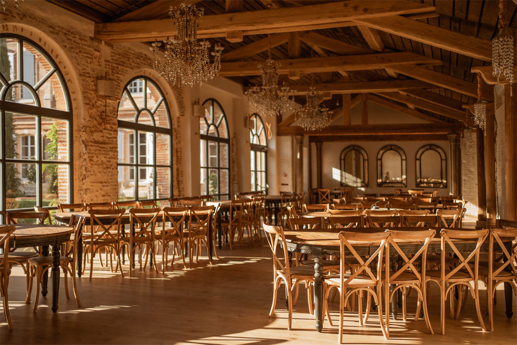La salle de réception accueille 140 personnes en dîner assis, tables et chaises incluses.