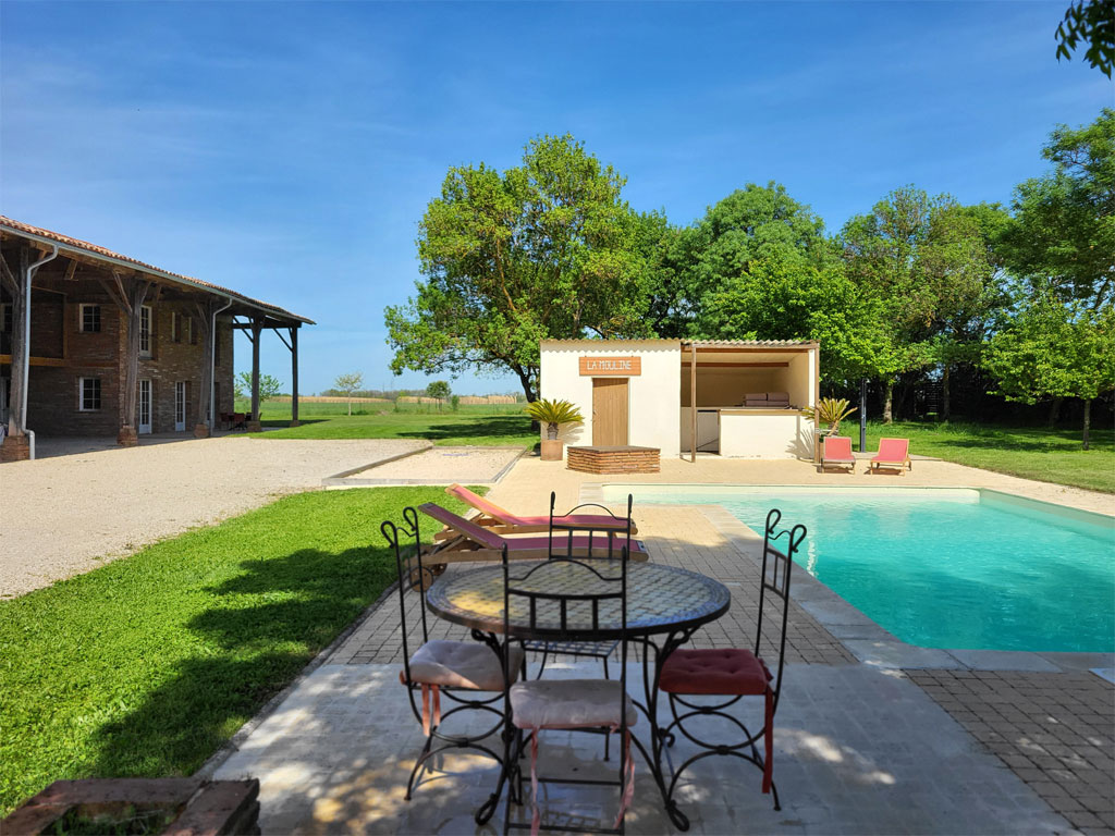 Piscine privative protégée par un système d'alarme agréé - Salon de piscine - Terrasse - Salon de jardin - Chaises longues - Terrain de pétanque (boules fournies) - Raquettes/balles de ping-pong fournies