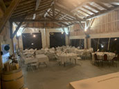 Grange réception : Tables rondes (x8) pour 54 pers + Tables rectangulaires (x4) pour 36 pers - Tonneaux (x4) - Chaises