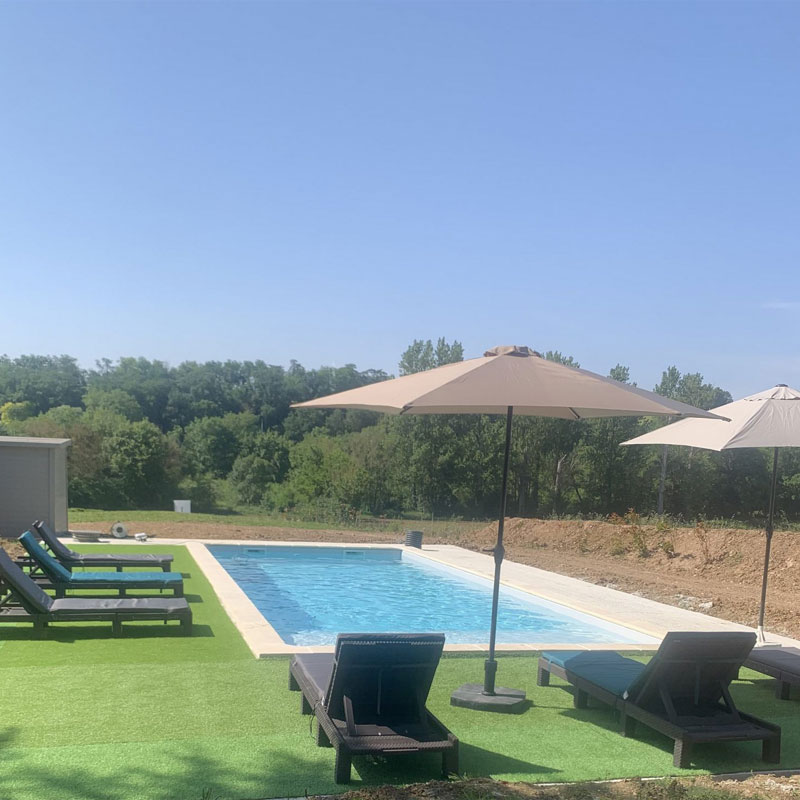 Piscine extérieure avec mobilier (chaises longues, chiliennes, parasols..).