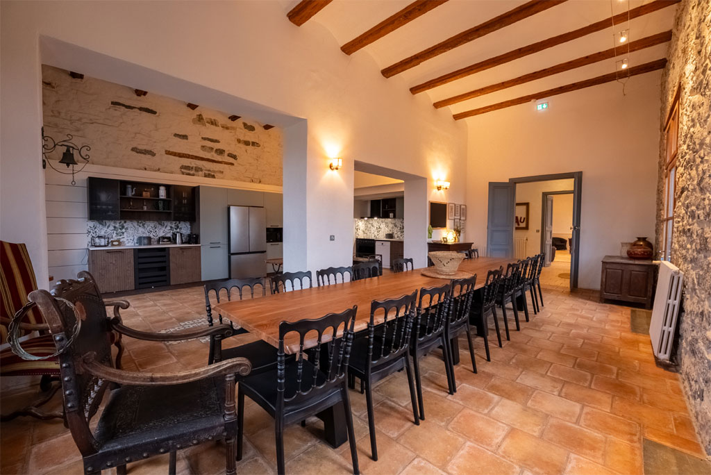 - une grande cuisine conviviale avec une grande table, équipée pour repas 26 convives