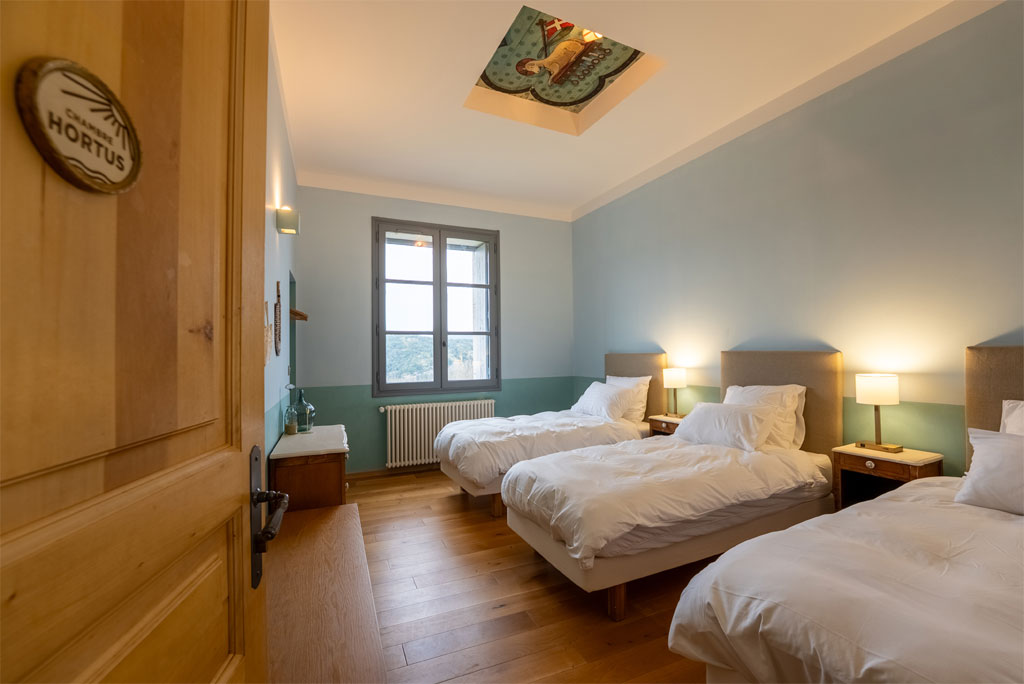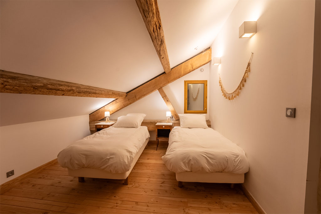 - 6 chambres dont une chambre PMR (3 chambres avec lit en 160, 2 chambres avec lit en 160 et lit en 90, 1 chambre avec 6 lits en 90)