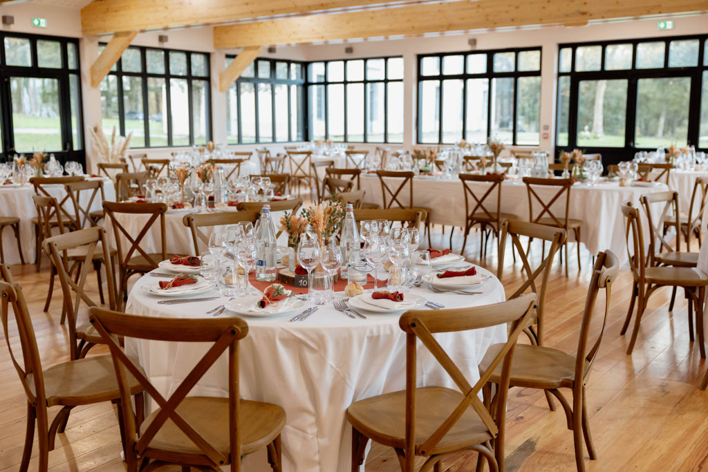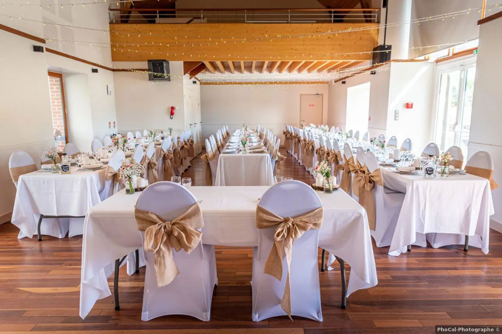 - Salle de réception Léquinais : superficie de 86m² pouvant accueillir au maximum 80 personnes assises, avec le barnum de 50m² pouvant accueillir 40 personnes assises supplémentaire. Un total de 120 personnes assises.