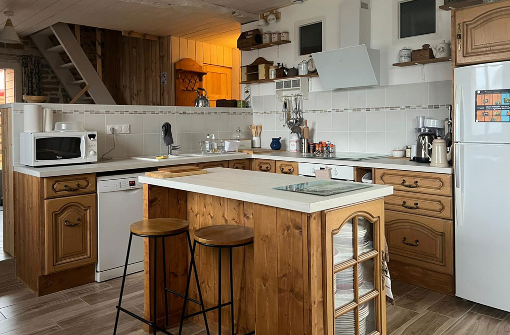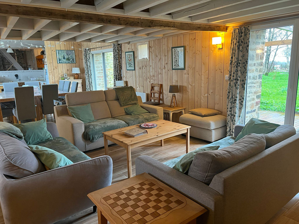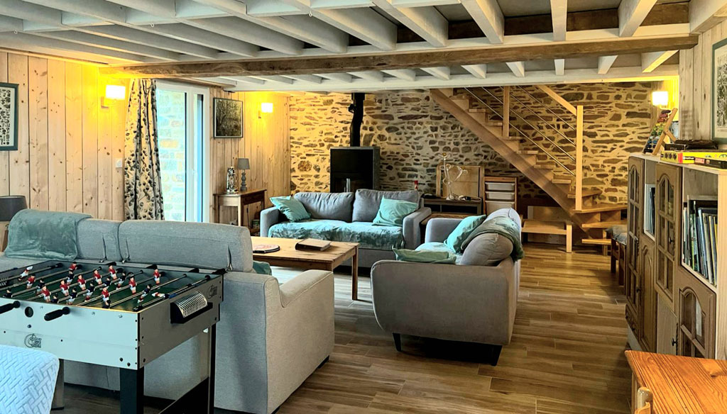 La grande pièce de vie de 90 m², véritable cœur du gîte, comprend :