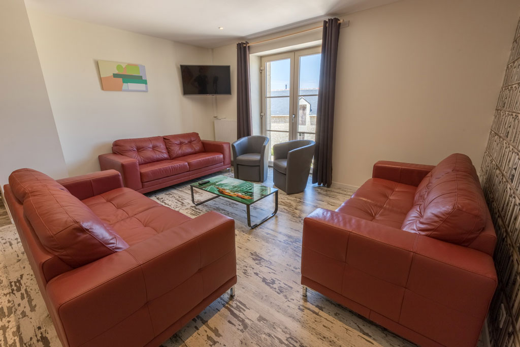 R.d.c. accès personne à mobilité réduite : séjour-salon (poêle à bois,TV, billard, baby-foot), cuisine (2 lave-vaisselles), arrière cuisine, 1e ch PMR (lit 160), salle d'eau PMR avec WC, WC. Etage : salon (TV), 2e ch (lit 160, 1 lit 90, salle d'eau avec WC), 3e ch (1 lit 160), 4e ch (3 lits 90), 5e ch (5 lits 90), 2 salles d'eau, 2 WC. Chauffage central bois (inclus). Cour close avec portique et terrain de pétanque. Parc en commun. Lit bébé.