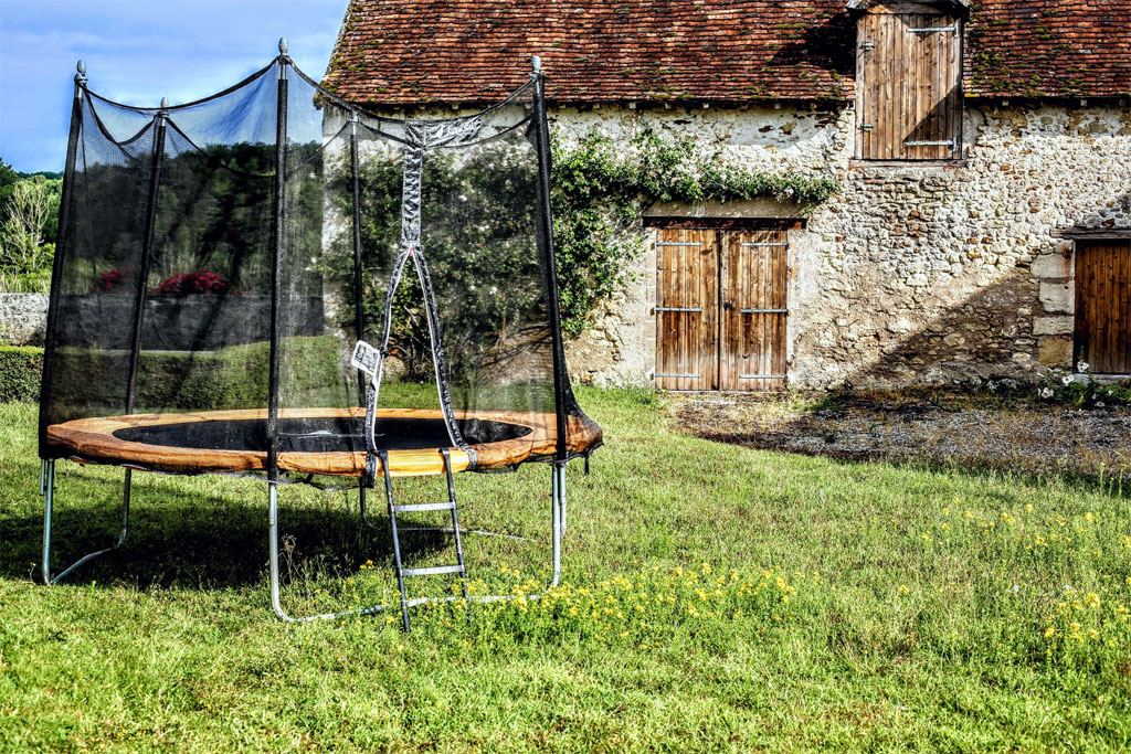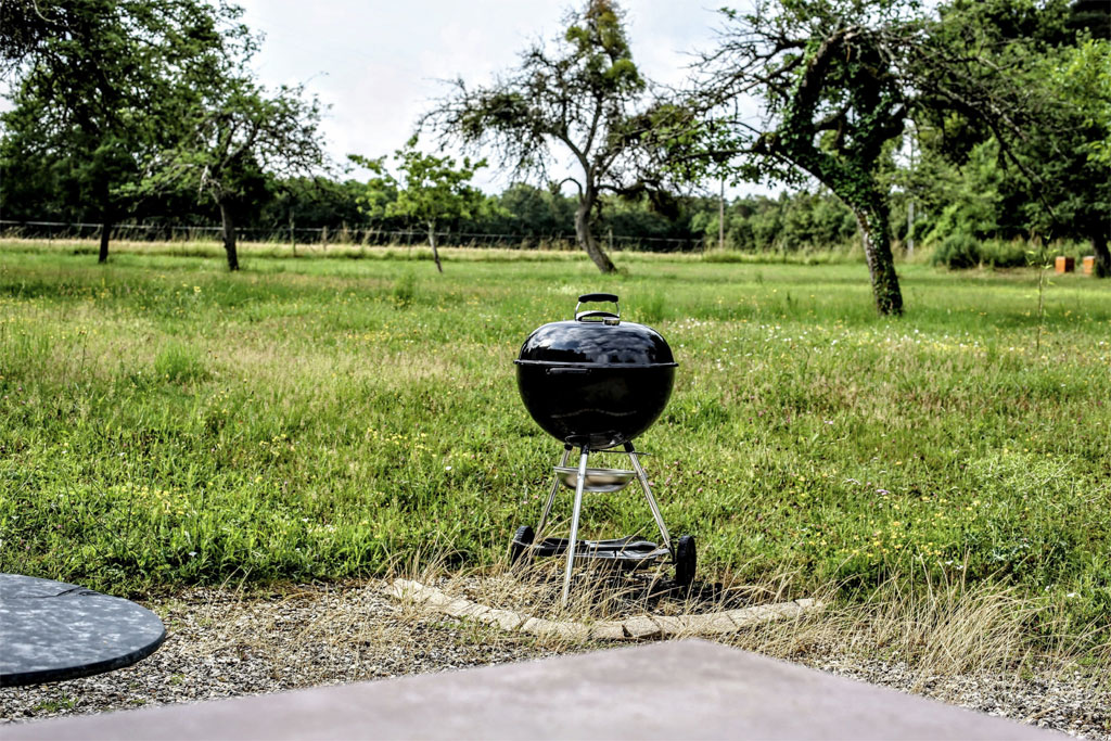 Grand jardin privatif de 1500 m² sans vis-à-vis (sinon les arbres et les champs avoisinants) - Terrasse - Brasero - Plancha - Barbecue Weber - Salon de jardin - Chaises longues - Terrain de pétanque - Trampoline)
