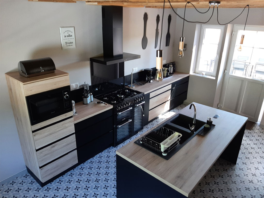Réfrigérateur - Congélateur - Plaques de cuisson gaz 5 feux - Four - Micro-ondes - Vaisselle - Lave-vaisselle